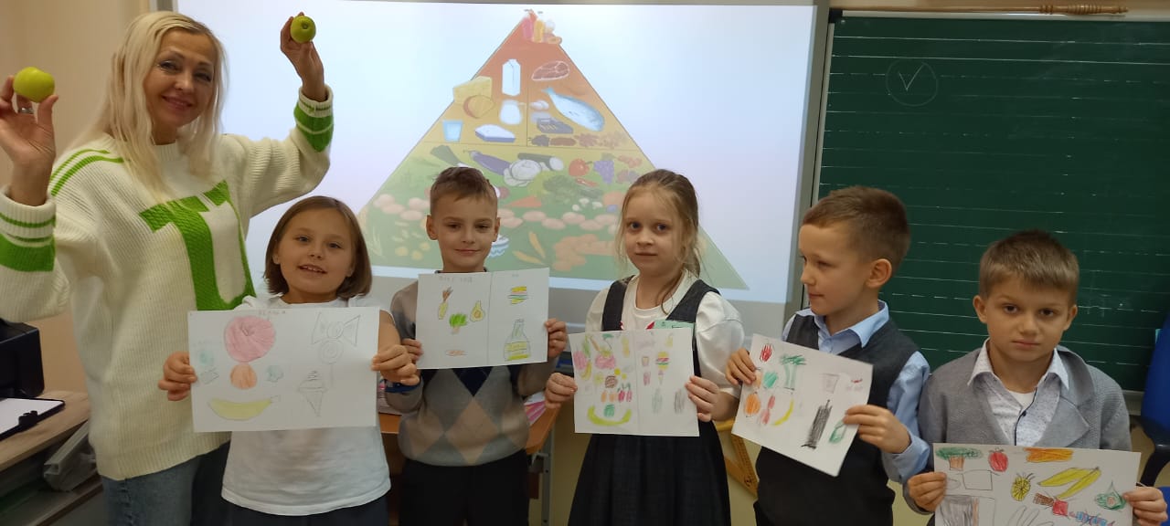 Обучающиеся 1- 4 классов с удовольствием прослушали лекции на такие темы как «Здоровая еда – залог нашего здоровья», «Правильное питание» и «Здоровый образ жизни», также ребятам рассказали о пирамиде здорового питания, где не забыли затронуть тему о вреде «фаст-фуда»! По итогам лекций и бесед в классах начальной школы ученики с удовольствием приняли участие в викторинах, в конкурсах рисунков и в оформлении плакатов по пройденной теме с дальнейшим оформлением выставок в классах.