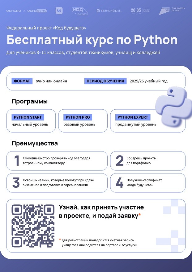 Код будущего – это федеральная образовательная программа, в рамках которой школьники могут освоить современные языки программирования. Бесплатная программа рассчитана на годовой курс обучения программированию для учеников 8-11 классов.