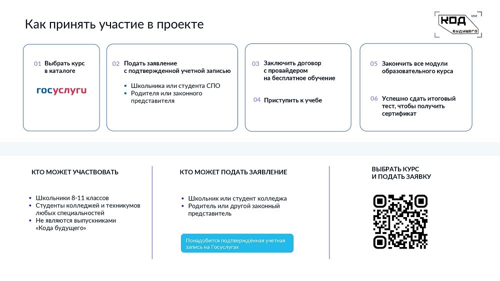 Чтобы принять участие в проекте «Код будущего. Искусственный интеллект», необходимо подать заявление на ЕПГУ (https://www.gosuslugi.ru/ai). Для это потребуется паспорт гражданина Российской Федерации и подтвержденная учетная запись на ЕПГУ. Подать заявление может как сам обучающийся, так и его родитель (законный представитель).