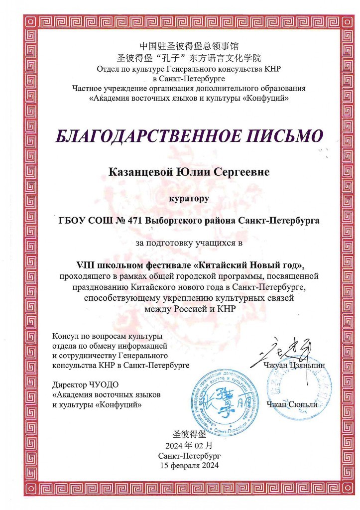 15 февраля 2024 г. наша школа приняла участие в VIII школьном фестивале “Китайский Новый год”, направленном на укрепление дружбы и развитие взаимопонимания между китайским и российским народами, ознакомление российской молодежи с культурой и традициями Китая. Организаторами мероприятия выступили Генеральное консульство КНР в Санкт Петербурге и Комитет по внешним связям Санкт-Петербурга при поддержке Комитета по образованию Санкт-Петербурга. В своей приветственной речи врио консула Китайской Народной республики господин Чжан Сяоцин поздравил всех присутствующих гостей и отметил, что с каждым годом количество участников Фестиваля увеличивается. Благодаря совместным усилиям Комитета по образованию Санкт-Петербурга, руководителей школ и учителей уровень преподавания китайского языка в нашем городе является одним из лучших в России.
