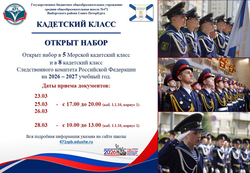 С 01.09.2021 года кадетские классы открыты в ГБОУ школе №471 Выборгского района Санкт-Петербурга. Высокое звание кадет носит 142 обучающихся нашей школы. Сегодня кадеты — активные участники акций, торжественных мероприятий, парадов и конкурсов.